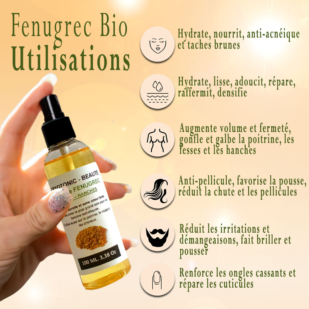 ✨ En résumé, l’huile de fenugrec bio est un véritable soin complet : raffermissant pour le corps, réparateur pour la peau et fortifiant pour les cheveux.